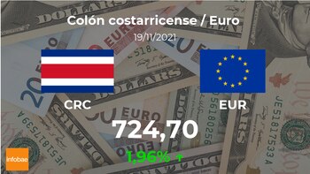 El euro se negocia a las 12:00 horas a 724,70 colones costarricenses, lo cual implicó una subida del 1,96% frente a la cotización del día anterior, cuando cotizó a 710,79 colones costarricenses.