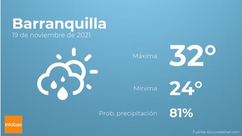 A lo largo de la mañana en Barranquilla se prevén nubes y claros con alguna llovizna. Según pasen las horas tendremos más nubes que claros con tormentas acompañadas de lluvia. En relación a las temperaturas, estas oscilarán entre una máxima de 32 y una mínima de 24 grados centígrados. Viento del este de carácter débil con rachas de hasta 22 km/h.