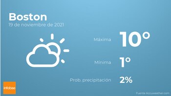 Hoy por la mañana en Boston tendremos nubes y claros. A medida que avance el día se esperan cielos despejados. Con respecto a las temperaturas, estas se moverán entre los 10 grados de máxima y 1 de mínima. Junto a todo esto, se esperan vientos con rachas de hasta 54 km/h.
