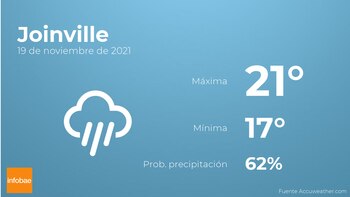Para el día de hoy en Joinville el cielo estará cubierto con probabilidad de alguna llovizna. En cuanto a las temperaturas, estas oscilarán entre los 21 grados de máxima y 17 de mínima. En general habrá vientos en calma.