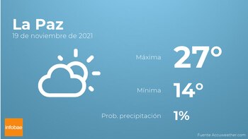 Hoy a primera hora en La Paz habrá escasa nubosidad. A medida que avance el día tendremos cielos despejados. En cuanto a las temperaturas, oscilarán entre una máxima de 27 y una mínima de 14 grados centígrados. Además, se esperan vientos del suroeste de carácter flojo con valores de hasta 26 km/h.