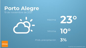 En las primeras horas del día en Porto Alegre se prevén nubes y claros. Por la tarde tendremos cielos despejados. En relación a las temperaturas, estas oscilarán entre los 23 grados de máxima y 10 de mínima. Viento del sureste sin apenas intensidad con valores de hasta 18 km/h.