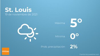 Hoy en St. Louis se esperan más nubes que claros. En cuanto a las temperaturas, variarán entre una máxima de 5 y una mínima de 0 grados. Junto a todo esto, se esperan vientos del oeste sin apenas intensidad con valores de hasta 18 km/h.