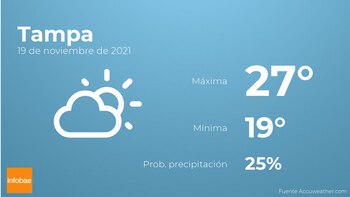 Hoy a primera hora en Tampa habrá nubes y claros con poca probabilidad de precipitaciones. A medida que avance el día el cielo estará cubierto con poca probabilidad de lluvias. Las temperaturas estarán entre los 27 grados de máxima y 19 de mínima. Junto a todo esto, se esperan vientos del noreste de carácter flojo con valores de hasta 28 kilómetros por hora.