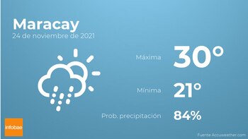 A lo largo de la mañana en Maracay tendremos más nubes que claros con alguna llovizna. Según pasen las horas el cielo estará cubierto con probabilidad de tormentas acompañadas de lluvia. En cuanto a las temperaturas, estarán entre los 30 grados de máxima y 21 de mínima. En general, vientos de poca intensidad con valores de hasta 9 km/h.