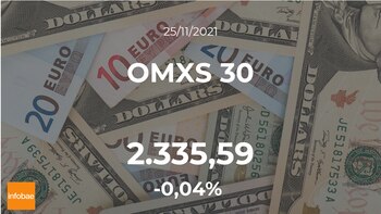 Sesión sin grandes cambios para el OMXS 30, que acabó la jornada del jueves 25 de noviembre con una leve subida del 0,04%, hasta los 2.335,59 puntos. El OMXS 30 marcó un máximo de 2.348,46 puntos y un volumen mínimo de 2.326,98 puntos. El rango de cotización para el OMXS 30 entre su punto más alto y el más bajo (máximo-mínimo) durante este día se situó en el 0,91%.