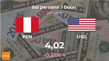 El dólar estadounidense se pagó a las 21:00 horas a 4,02 soles, de modo que implicó una disminución del 0,21% con respecto a la cotización del día anterior, que fue de 4,03 soles.