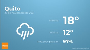 Durante las primeras horas del día en Quito el cielo estará cubierto con lluvia. A medida que avance el día el cielo estará cubierto con alguna llovizna. En cuanto a las temperaturas, variarán entre una máxima de 18 y una mínima de 12 grados. Viento sin apenas intensidad con rachas de hasta 18 km/h.