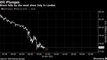 Brent Oil Sheds Almost $5 as New Covid-19 Variant Roils Markets
