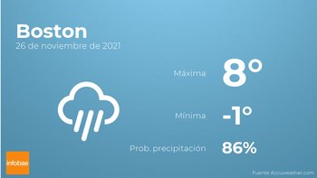Para hoy en Boston el cielo estará cubierto con lluvia. En cuanto a las temperaturas, estas oscilarán entre los 8 grados de máxima y -1 de mínima. En general, vientos con valores de hasta 52 kilómetros por hora.