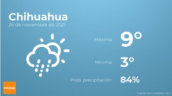 Para hoy por la mañana en Chihuahua se esperan más nubes que claros con alguna llovizna. A medida que avance el día habrá más nubes que claros con probabilidad de lloviznas generalizadas e intermitentes. En cuanto a las temperaturas, oscilarán entre una máxima de 9 y una mínima de 3 grados centígrados. Además, se esperan vientos de carácter débil con cifras de hasta 11 km/h.
