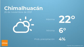 Para hoy por la mañana en Chimalhuacán se prevé escasa nubosidad. Según pasen las horas se esperan más nubes que claros. Con respecto a las temperaturas, oscilarán entre una máxima de 22 y una mínima de 6 grados. Viento del noroeste de poca intensidad con rachas de hasta 15 kilómetros por hora.