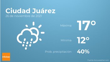 Durante las primeras horas del día en Ciudad Juárez habrá más nubes que claros con probabilidad de lloviznas generalizadas. Por la tarde habrá cielos nubosos con escasa probabilidad de precipitaciones. Las temperaturas estarán entre una máxima de 17 y una mínima de 12 grados centígrados. Viento de carácter flojo con rachas de hasta 15 km/h.