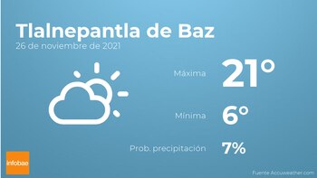 Para hoy por la mañana en Tlalnepantla de Baz se prevén pocas nubes. Según pasen las horas tendremos nubes y claros. Por lo que respecta a las temperaturas, estas oscilarán entre los 21 grados de máxima y 6 de mínima. Además, se esperan vientos del noreste de carácter flojo con rachas de hasta 13 km/h.