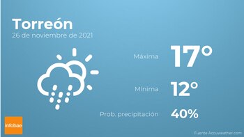 Durante las primeras horas del día en Torreón habrá más nubes que claros con probabilidad de lloviznas generalizadas. A medida que avance el día estará muy nublado con baja probabilidad de que haya precipitaciones. En relación a las temperaturas, estas variarán entre una máxima de 17 y una mínima de 12 grados. Junto a todo esto, se esperan vientos del noreste de carácter débil con rachas de hasta 17 km/h.