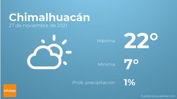 Durante la mañana en Chimalhuacán habrá pocas nubes. Según pasen las horas se esperan cielos despejados. Por lo que respecta a las temperaturas, estas se moverán entre los 22 grados de máxima y 7 de mínima. En general, vientos de poca intensidad con rachas de hasta 11 km/h.