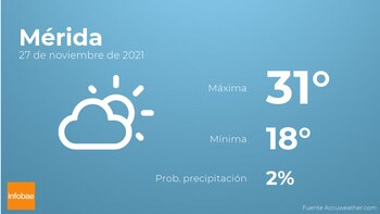 Durante las primeras horas del día en Mérida se esperan pocas nubes. Según pasen las horas se prevén cielos despejados. En relación a las temperaturas, estas oscilarán entre una máxima de 31 y una mínima de 18 grados centígrados. En general, vientos de carácter flojo con cifras de hasta 17 kilómetros por hora.
