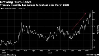 (Bloomberg) -- La volatilidad de los bonos se está acelerando a medida que el covid-19 y los temores de inflación causan estragos en las perspectivas de las políticas.