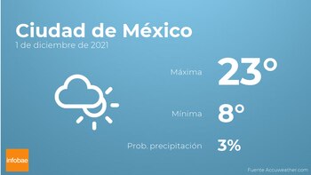 En las primeras horas del día en Ciudad de México habrá más nubes que claros. Según pasen las horas tendremos pocas nubes. Las temperaturas oscilarán entre una máxima de 23 y una mínima de 8 grados centígrados. Viento de poca intensidad con rachas de hasta 24 km/h.