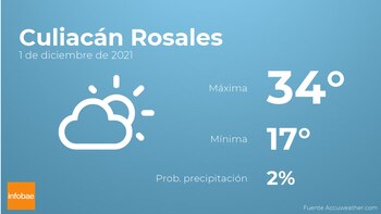 A lo largo del día de hoy en Culiacán Rosales tendremos pocas nubes. Las temperaturas oscilarán entre una máxima de 34 y una mínima de 17 grados. Junto a todo esto, se esperan vientos del noroeste sin apenas intensidad con rachas de hasta 13 km/h.