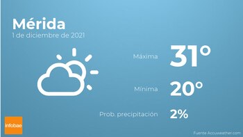 Hoy a primera hora en Mérida tendremos nubes escasas. Según pasen las horas se prevén cielos sin nubes. En cuanto a las temperaturas, oscilarán entre una máxima de 31 y una mínima de 20 grados centígrados. En general, vientos sin apenas intensidad con rachas de hasta 17 km/h.