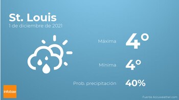 En la mañana de hoy en St. Louis tendremos nubes y claros con probabilidad de lloviznas generalizadas. Por la tarde habrá más nubes que claros con probabilidad de algún episodio de precipitaciones aisladas. Las temperaturas se moverán entre una máxima de 4 y una mínima de 4 grados. En general, vientos con valores de hasta 39 km/h.