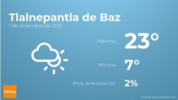 En la mañana de hoy en Tlalnepantla de Baz habrá más nubes que claros. Por la tarde se prevé nubes escasas. En cuanto a las temperaturas, estas se moverán entre una máxima de 23 y una mínima de 7 grados centígrados. En general, vientos de poca intensidad con valores de hasta 22 kilómetros por hora.