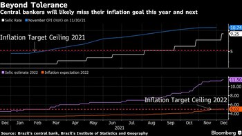 Tales preocupaciones han obligado al banco central a revisar al alza sus pronósticos de inflación para 2022 a niveles por encima del objetivo, según las actas de la reunión de política monetaria del 7 al 8 de diciembre publicadas el martes. También concluyeron que la tasa de interés neutral de Brasil, que ni estimula ni frena la economía, probablemente esté subiendo.