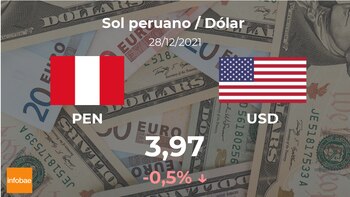 El dólar estadounidense se negoció a las 21:05 horas a 3,97 soles, de manera que implicó una bajada del 0,5% con respecto a los 3,99 soles del día anterior.