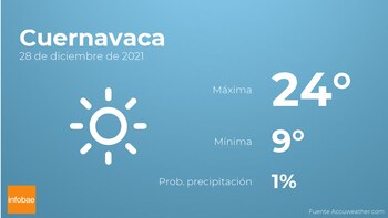 En el día de hoy en Cuernavaca tendremos cielos sin nubes. En cuanto a las temperaturas, estas se moverán entre una máxima de 24 y una mínima de 9 grados. Viento del sur de carácter débil con valores de hasta 26 kilómetros por hora.