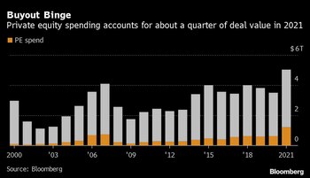 Las empresas de adquisición, que cuentan con más de US$2 billones de “polvo seco”, probablemente buscarán adquisiciones aún mayores en 2022, según Eric Schiele, socio corporativo del bufete de abogados Kirkland & Ellis. “No creo que esa parte del mercado vaya a ninguna parte”, dijo, añadiendo que los patrocinadores generalmente tienen una ventaja sobre los estratégicos en el actual entorno antimonopolio más estricto.