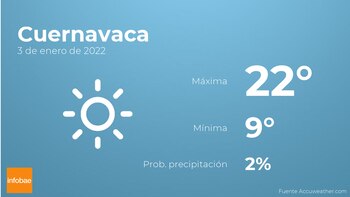 En el día de hoy en Cuernavaca tendremos cielos sin nubes. Con respecto a las temperaturas, estas se moverán entre una máxima de 22 y una mínima de 9 grados. Junto a todo esto, se esperan vientos de carácter flojo con rachas de hasta 24 kilómetros por hora.
