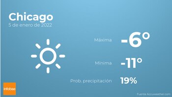 Para hoy en Chicago tendremos cielos sin nubes con poca probabilidad de lluvias. Por lo que respecta a las temperaturas, estas se moverán entre una máxima de -6 y una mínima de -11 grados centígrados. Además, se esperan vientos con valores de hasta 71 km/h.
