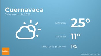 Durante las primeras horas del día en Cuernavaca se prevé escasa nubosidad. Por la tarde tendremos cielos sin nubes. En cuanto a las temperaturas, oscilarán entre una máxima de 25 y una mínima de 11 grados centígrados. En general, vientos del sureste de carácter flojo con cifras de hasta 24 km/h.