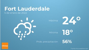 Durante la mañana en Fort Lauderdale se esperan más nubes que claros con probabilidad de lloviznas generalizadas e intermitentes. Según pasen las horas habrá nubes y claros con poca probabilidad de precipitaciones. Por lo que respecta a las temperaturas, estas variarán entre los 24 grados de máxima y 18 de mínima. Junto a todo esto, se esperan vientos del sureste de carácter flojo con rachas de hasta 33 kilómetros por hora.
