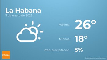 Para el día de hoy en La Habana se prevén pocas nubes. Por lo que respecta a las temperaturas, estas variarán entre una máxima de 26 y una mínima de 18 grados. En general, vientos sin apenas intensidad con rachas de hasta 22 km/h.