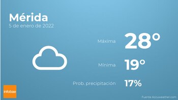 A lo largo de la mañana en Mérida estará muy nublado con poca probabilidad de lluvias. A medida que avance el día se esperan nubes y claros con escasa probabilidad de precipitaciones. En relación a las temperaturas, estas se moverán entre los 28 grados de máxima y 19 de mínima. Junto a todo esto, se esperan vientos del este sin apenas intensidad con rachas de hasta 24 kilómetros por hora.