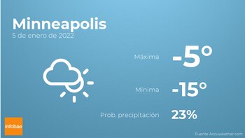 Para las primeras horas del día en Minneapolis se esperan más nubes que claros con poca probabilidad de lluvias. Por la tarde habrá cielos cubiertos con algún episodio de precipitaciones aisladas. Con respecto a las temperaturas, variarán entre una máxima de -5 y una mínima de -15 grados centígrados. Viento de poca intensidad con rachas de hasta 33 kilómetros por hora.