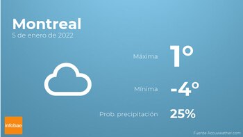 Hoy por la mañana en Montreal habrá cielos nubosos con poca probabilidad de lluvias. Según pasen las horas tendremos cielos cubiertos con probabilidad de lloviznas generalizadas. Con respecto a las temperaturas, oscilarán entre una máxima de 1 y una mínima de -4 grados. Junto a todo esto, se esperan vientos de carácter débil con rachas de hasta 29 km/h.