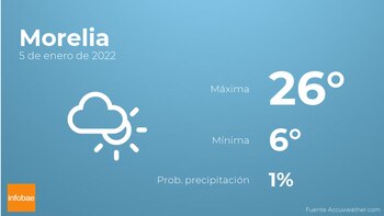 Durante la mañana en Morelia se esperan más nubes que claros. A medida que avance el día tendremos pocas nubes. En cuanto a las temperaturas, estas se moverán entre una máxima de 26 y una mínima de 6 grados centígrados. Viento del sur de carácter flojo con cifras de hasta 20 kilómetros por hora.