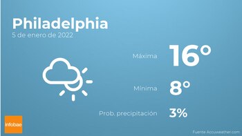 Durante la mañana en Philadelphia se esperan más nubes que claros. Según pasen las horas tendremos más nubes que claros con poca probabilidad de precipitaciones. Con respecto a las temperaturas, estas se moverán entre una máxima de 16 y una mínima de 8 grados centígrados. Viento de carácter flojo con cifras de hasta 13 kilómetros por hora.