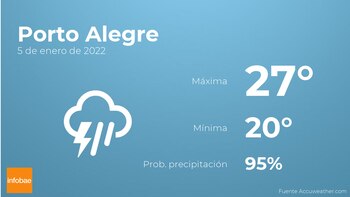 Para hoy por la mañana en Porto Alegre el cielo estará cubierto con tormentas acompañadas de lluvia. Según pasen las horas se esperan más nubes que claros con probabilidad de algún episodio de precipitaciones aisladas. En cuanto a las temperaturas, variarán entre una máxima de 27 y una mínima de 20 grados centígrados. En general, vientos del sur de carácter débil con cifras de hasta 57 km/h.