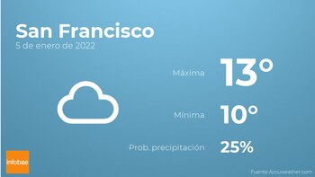 Durante las primeras horas del día en San Francisco habrá cielos nubosos con baja probabilidad de que haya precipitaciones. A medida que avance el día se prevén cielos cubiertos con escasa probabilidad de precipitaciones. En relación a las temperaturas, estas se moverán entre los 13 grados de máxima y 10 de mínima. En general, vientos de carácter débil con cifras de hasta 17 km/h.