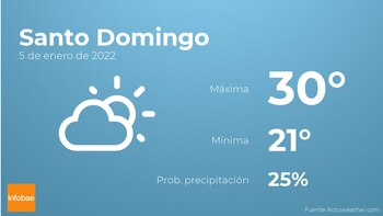 Durante las primeras horas del día en Santo Domingo se prevé escasa nubosidad con poca probabilidad de precipitaciones. A medida que avance el día se esperan nubes y claros con probabilidad de lloviznas generalizadas. Por lo que respecta a las temperaturas, estas variarán entre una máxima de 30 y una mínima de 21 grados centígrados. En general, vientos de poca intensidad con rachas de hasta 26 kilómetros por hora.