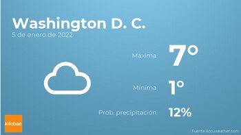 Durante las primeras horas del día en Washington D. C. habrá cielos nubosos con poca probabilidad de lluvias. A medida que avance el día se prevén más nubes que claros. Con respecto a las temperaturas, estas variarán entre los 7 grados de máxima y 1 de mínima. Junto a todo esto, se esperan vientos de carácter flojo con rachas de hasta 22 km/h.