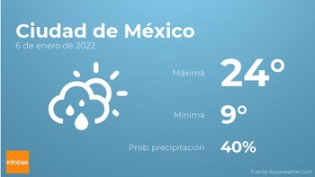 Para las primeras horas del día en Ciudad de México tendremos nubes y claros con probabilidad de lloviznas generalizadas e intermitentes. Por la tarde se espera escasa nubosidad con probabilidad de alguna precipitación aislada. Por lo que respecta a las temperaturas, estas oscilarán entre los 24 grados de máxima y 9 de mínima. Además, se esperan vientos de carácter flojo con cifras de hasta 30 km/h.