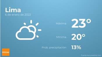 A lo largo de la mañana en Lima se esperan nubes y claros con baja probabilidad de que haya precipitaciones. Por la tarde tendremos más nubes que claros. Con respecto a las temperaturas, estas se moverán entre una máxima de 23 y una mínima de 20 grados. Además, se esperan vientos del sur de carácter débil con cifras de hasta 26 kilómetros por hora.