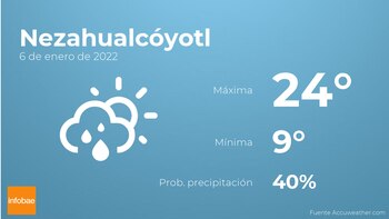 En las primeras horas del día en Nezahualcóyotl tendremos nubes y claros con probabilidad de lloviznas generalizadas. A medida que avance el día se prevén pocas nubes con probabilidad de alguna precipitación aislada. En cuanto a las temperaturas, variarán entre una máxima de 24 y una mínima de 9 grados. Además, se esperan vientos del este sin apenas intensidad con valores de hasta 24 kilómetros por hora.