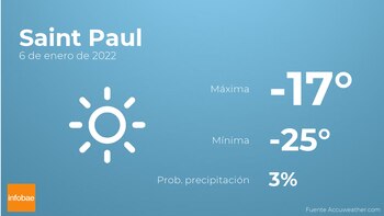 En la mañana de hoy en Saint Paul se prevén cielos despejados. A medida que avance el día tendremos cielos despejados. Por lo que respecta a las temperaturas, estas oscilarán entre los -17 grados de máxima y -25 de mínima. Además, se esperan vientos del noroeste de carácter débil con cifras de hasta 26 kilómetros por hora.