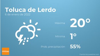 Durante la mañana en Toluca de Lerdo se prevén nubes y claros con probabilidad de tormentas y lluvia. Según pasen las horas se esperan pocas nubes con probabilidad de alguna precipitación aislada. En cuanto a las temperaturas, estas oscilarán entre los 20 grados de máxima y 1 de mínima. Junto a todo esto, se esperan vientos sin apenas intensidad con rachas de hasta 26 kilómetros por hora.